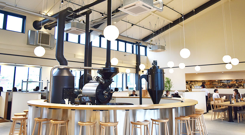 新店舗では、店内中央に大型の焙煎機を設置。焙煎の香りや音を感じながら、焼きたパンと入れたてのコ