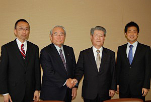経営統合を発表した、豊田康裕桑宗副社長、豊田直之桑宗社長、中村成朗中村角会長、中村一朗中村角社長(左から)
