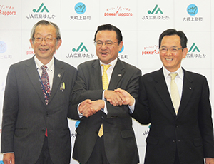 笑顔で握手を交わす、左から横本正樹組合長、國廣喜和武社長、高田幸典町長