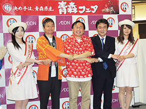 【中国】イオンリテール中四国カンパニーは、青森県の豊かな食の魅力を発信する「青森フェア」を、3~5日の期間「イオンモール広島府中」で開催した。イオンと青森県は、2011年4月に包括連携協定を締結しており、同フェアでは、魅力ある青森県産品の販売はもちろん、青森県の観光資源についての紹介も行われた。3日には、三村申吾青森県知事や三上達規むつ市経済部長などの青森県関係者も駆け付け、記念セレモニーが開催された。 同フェアは今回で6回目となり、早生ふじやジョ