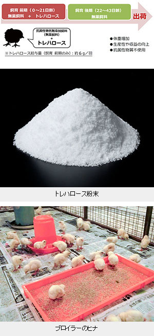 【中国】NAGASEグループの林原は、山梨県畜産酪農技術センターらと共同で、ブロイラーの育成期間に抗菌性物質無添加飼料を用いた際のトレハロース給与が生産性に及ぼす影響について調査した。その結果、トレハロースを与えたヒナの方が、通常のエサで育てたヒナよりも大きく成長し、さらにその後、トレハロース給与をやめても出荷体重が増加していることが分かった。これにより、養鶏農家の生産性や収益の向上が見込めるとともに、消費者が求める抗菌性物質が含まれない無薬飼料を使用した、より安全・安心な