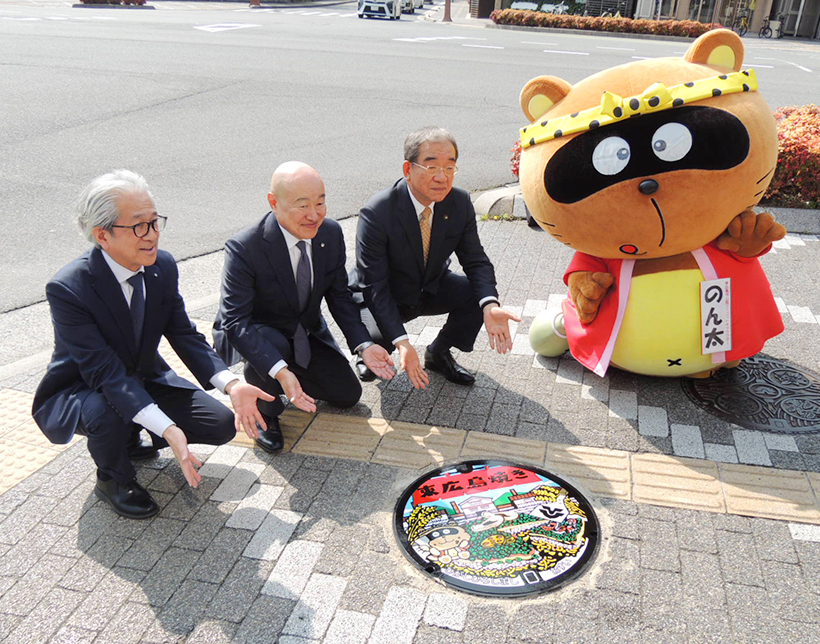 【中国】オタフクソースは、昨年4月に誕生した広島県東広島市のご当地お好み焼き「東広島焼き」をデザインしたマンホールを東広島市に寄贈した。3月27日には東広島市役所で高垣廣徳東広島市長、佐々木直義オタフクソース会長、そしてマンホールを製造した友廣和照友鉄工業社長など関係者が出席した寄贈式が行われ、その後、同市の観光名所である「酒蔵通り」の入口付近にある場所にマンホールを設置する設置式が行われた。