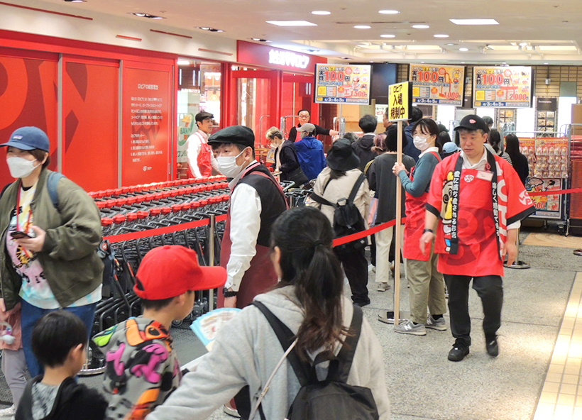 【中国】OICグループは3日、広島市中区に「食生活ラブラブロピア広島パセーラ店」をオープンさせた。 神奈川県からスタートした「ロピア」は現在国内外で約150店舗を展開しているが中四国エリアでの出店は今回が初めてとなる。「食のテーマパーク」を掲げた約430坪の店内には買い物を目で見ても楽しめるように山盛りの陳列や目を引くカラフルなPOPなどで売場が演出されていた。青果売場には山盛りのパイナップルが陳列され、その隣には全国でも同店が初導入というパイナップル