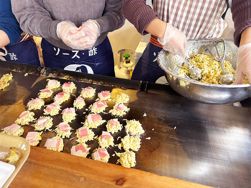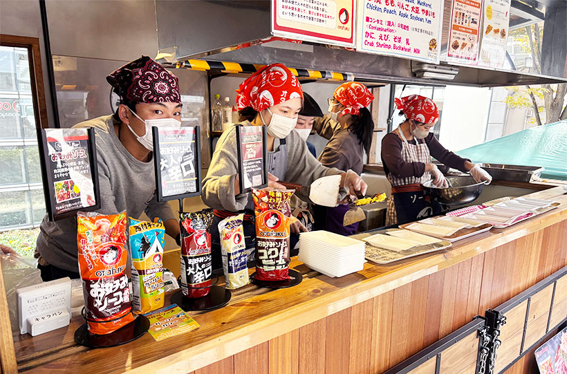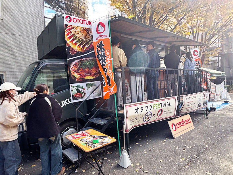 オタフクソースは、22年から明治大学農学部・本所靖博准教授の研究室(本所ゼミ)に協力し、イベントなどを通じてお好み焼きやソースの魅力・価値を幅広い世代に伝えている。今回、「オタフク FESTIVAL」を明治大学生田キャンパス内で11月19~20日に実施。主力の「お好みソース」や「お好みソース 大人の辛口」など5種類の商品を活用したお好み焼きの提供のほか、学内ベーカリーとコラボした商品を11月17~21日に販売した。