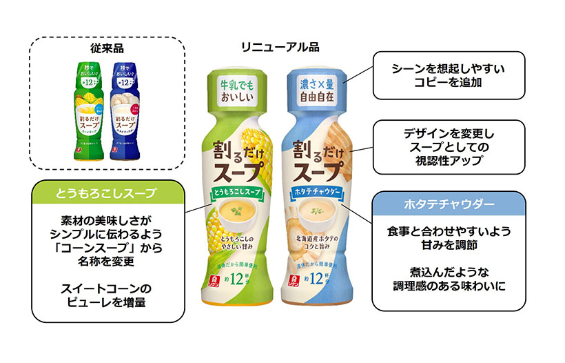 理研ビタミンは「割るだけスープ」シリーズから「同町の中華スープ」=写真=を25日に発売するとともに、同シリーズの既存2品をリニューアルする。「コーンスープ」は素材のおいしさを分かりやすく伝えるために「とうもろこしスープ」に名称を変更するなど、新商品と合わせたシリーズ3品で自宅での朝食や昼食の満足度アップに貢献する。 同社は、継続的な物価上昇や猛暑日の増加により外出の範囲・頻度が減少する傾向がみられ、内食需要が高まっていると推察。自宅でも簡便においし