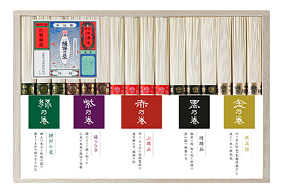 【関西】カネス製麺は今中元に「揖保五輪」=写真=を投入。揖保乃糸の産地である播州地方・たつの市にゆかりのある「宮本武蔵」が書き記した「五輪の書」をモチーフに揖保乃糸から5種類のそうめんを厳選し詰め合わせた。多くの人に広く食べられている「上級品」から、国産小麦使用の「縒りつむぎ」、希少な「播州小麦」、2番目に麺が細い「特級品」、組合の専用倉庫で1年間寝かせた「熟成麺」を五輪の書になぞらえてずらりと並べた。 昔から変わらない揖保乃糸のそうめんづくりの根