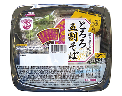 【関西】恩地食品は3月14日、「夏のめん処 とろろ五割そば」=写真=と「同おろし五割そば」をリニューアル新発売した。近年、夏の冷やし麺も五割そばの商品が多数見られることもあり、昨年リニューアルした当社こだわりの「冷し五割そば」を使用。上品な白めのそばに仕上げ、粒子感や風味・食感を引き出した。それに国産原材料を用いたとろろや大根おろしをトッピングし、セット麺に仕上げた。 恩地宏昌社長は「原材料が高騰しており、また従業員の生活も守っていかないといけない