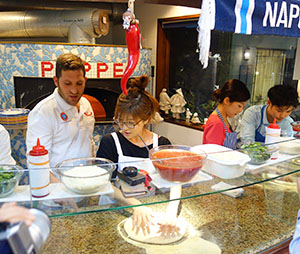ブロガーらのピザ手作りをサポートするペッペ氏(左)