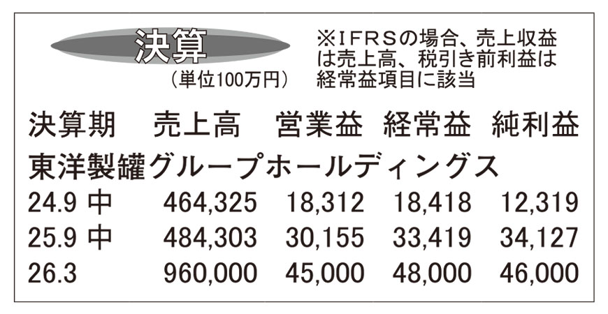 東洋製罐グループホールディングスの26年3月期第2四半期連結決算は、主力の包装容器事業で値上げや原材料・エネルギー価格の下落によるコスト減の影響もあり、増収・大幅増益とした。また政策保有株の売却による特別利益144億円を計上。売上高は前年比4.3%増の4843億円、営業利益64.7%増の301億円、経常利益81.4%増の334億円、純利益は約2.8倍の341億円。 包装容器事業の売上高は1.5%増3121億円、営業利益35.1%増196億円。うち主