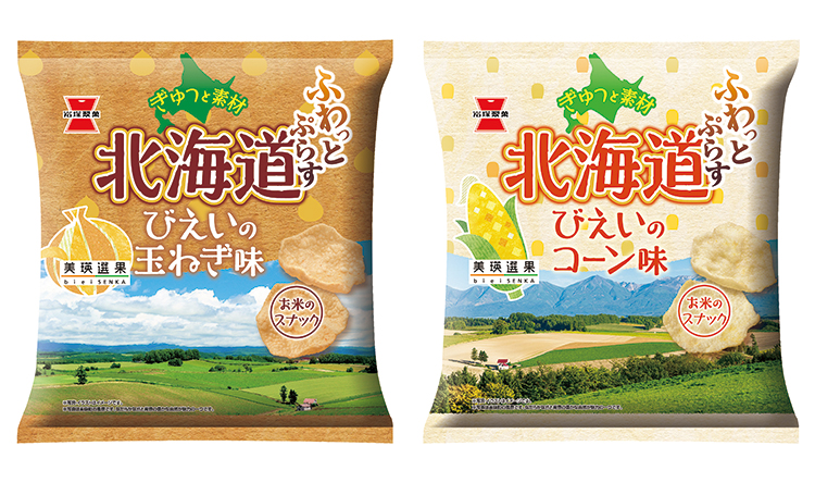 岩塚製菓は12日から期間限定で、北海道素材とコラボした「ふわっと」シリーズ新商品「40gふわっとぷらす ぎゅっと素材北海道びえいの玉ねぎ味」=写真(左)、「同コーン味」=同(右)=(いずれも参考価格200円前後)を全国販売する。道内に工場を持つ同社と美瑛町のアンテナショップ「美瑛選果」とのコラボ商品となる。 美瑛選果は、美瑛町のJAびえいが運営するアンテナショップで千歳空港内にも展開。同町の農産物や農産加工品を販売している。商品は、それぞれ美瑛特産