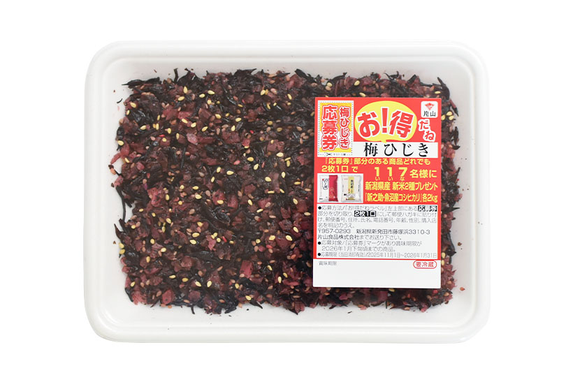 片山食品は、10月27日出荷分から12月12日出荷分まで、期間限定増量商品の「お!得だね 野沢菜めし」=写真=と「同梅ひじき」(いずれも180g入り)を販売している。それに合わせて、11月1日から1月31日まで、新潟県産ブランド米の「新之助」「魚沼産コシヒカリ」がそれぞれ抽選で2kgずつ当たるプレゼントキャンペーンを実施する。 「同野沢菜めし」は細かく刻んだ野沢菜と大根をうまみと焼きエビの風味が効いた醤油ベースの調味液に漬け込み、香ばしいごまを加え