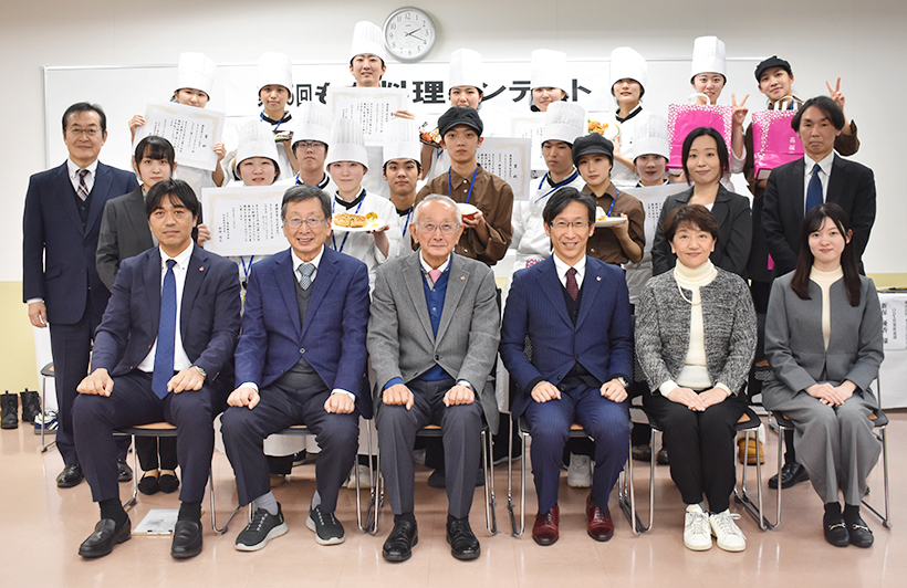 【新潟】マルシン食品は3日、新潟市のFood国際調理製菓専門学校で「餅料理コンテスト」を開催した。プロの料理人やパティシエを目指す学生らがもちを題材にチームで競う恒例の料理コンテストで、15回目となる今回は「ベビースターラーメン」でおなじみの菓子メーカー・おやつカンパニーが協力した。メーン料理とデザートの2部門に加えて、ベビースターラーメン単独、あるいはベビースターラーメンともちを組み合わせる複合部門の3部門で競作した。