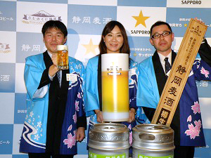 【静岡】サッポロビールは23日に「静岡麦酒〈樽生〉」を静岡県の業務用限定商品として発売するが、6日に静岡県庁内のレストランで発表会を行った。 同社は80年に静岡県中部の焼津市に工場を建設した。現在は同社製品の約3割を製造し、研究開発を行う重要な拠点となっている。同社は静岡県出身の企画担当者、醸造技術者、デザイナーなどでチーム「静岡っ子」を結成し「静岡らしい静岡のためのビール」の開発に取り組んだ。 「静岡麦酒〈樽生〉」は麦芽