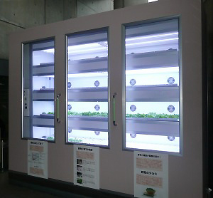 病院第1号の植物工場ユニット。前面ガラスは前後に動き作業スペースがとれる