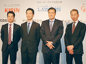 21日の設立説明会で、左から江崎グリコ・江崎悦朗氏、山田悟代表理事、ローソン・玉塚元一氏、キリン・橋本誠一氏