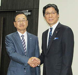 握手する山本良一JFR社長(右)と田邉道夫千趣会社長