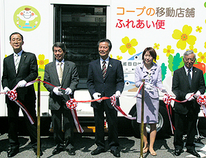 東京、埼玉、千葉の都県で展開するコープみらいは4日、同生協のミニコープ蔵波(くらなみ)店で移動店舗「ふれあい便」のお披露目式を開いた。高齢化が進む同県の袖ヶ浦市、市原市、木更津市などで、いわゆる買い物難民になりがちな組合員に対応する。コープみらいが所属するコープネット事業連合は長野県、茨城県で移動販売を実施しているが、千葉県では初めて。自治体、各地の自治会と連携しながら地域に貢献する。  コープネットは移動販売を2011年3月に起きた地震の被害が大き