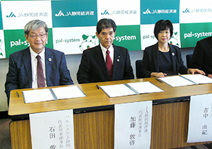左から石田敦史パルシステム静岡理事長、加藤敦啓JA静岡経済連理事長、吉中由紀パルシステム連合会副理事長