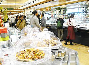 イオンリテールが開発しイオンモール東久留米(東京都東久留米市南沢5-17-62=4月23日グランドオープン)の核店イオン東久留米店は、全国に先駆けて和洋中の惣菜、米飯、サラダ、フルーツ、デザートを100g198円均一で量り売りする100坪のコーナー「マイセレクトデリ」の導入店舗だ。東久留米市と近隣商圏から都心部へ向かう顧客を集客するため、百貨店地下食品売場を意識して100品目を揃えた。  イオンリテールは、マイセレクトデリでの試みの検証を今後開発する
