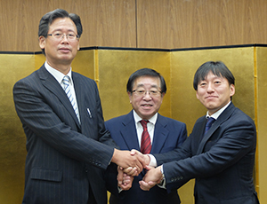 16年7月21日に経営統合で基本合意し、同日東京都内での会見を終えて握手するリテールパートナーズの田中康男社長(中)とマルキョウの斉田敏夫会長(左)、マルミヤストアの池邉恭行社長