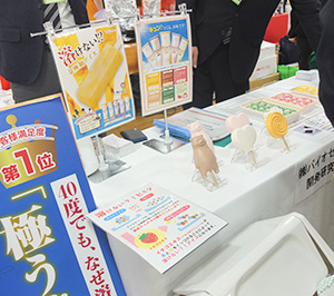 溶けないアイスクリームとして話題の「金座和(かなざわ)アイス」を製造するバイオセラピー開発研究センターは13日、東京・日本橋プラザで開催された三井食品主催の「月曜会春の新商品発表会」に出展=写真=し注目を集めた。 「金座和アイス」は常温で約1時間形状維持できるアイスクリーム。溶けにくい秘密は、アイスクリームの水分と油分は冷たい状態だと結合しているが、温度が高まると分離し、それが溶けるという現象になるが「金座和アイス」はイチゴポリフェノールを用いた特