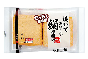 ◆厚揚げの常識覆す新発想で生まれた期待の一品 相模屋食料の「焼いておいしい絹厚揚げ」は、従来の絹厚揚げにない「もっちりとした食感」が最大の特徴。大豆と水とニガリだけで作るという豆腐の常識を打破し、従来の原材料にタピオカでんぷんを加えて作り上げた。このタピオカでんぷんが「もっちりとした食感」を生み出している。常識にとらわれていては、とても開発できない商品だ。 この「焼いておいしい絹厚揚げ」は、10年の発売当初、業界内から「こ