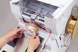 マックスは、菓子などを巾着袋に詰めた後の袋とじとタグ付けが同時にできる、電動式「タグ結束機」を2日発売した。同社によると業界初だという。手作業では1分間に2~3個しかできなかった作業が8~9個でき、均一に仕上げられる。タグの有無の選択により、巾着包装のみでもできる。今後、食品関連企業や包装資材関係者、菓子原材料関係者に提案していく。オープン価格。 袋口を差し込み口に押し込み、二つのスイッチを押すだけで、袋とじとタグ付けが同時にできる。家庭用100V