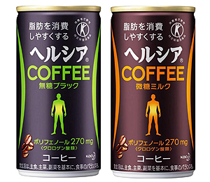 花王は今春、「ヘルシア」ブランドでコーヒー飲料市場に参入する。高濃度のコーヒークロロゲン酸を配合し、脂肪を消費しやすくなる効果が認められた特定保健用食品(トクホ)として「ヘルシアコーヒー」(写真)を展開。商品は「無糖ブラック」と「微糖ミルク」の2品で、4日から発売する。内容量は、185g缶でメーカー希望小売価格149円(税込み)。今年の販売目標は150万ケースを目指す。「ヘルシアコーヒー」は、コーヒー豆に含まれるポリフェノールのコーヒークロロゲン酸を1本当たり270mg配合