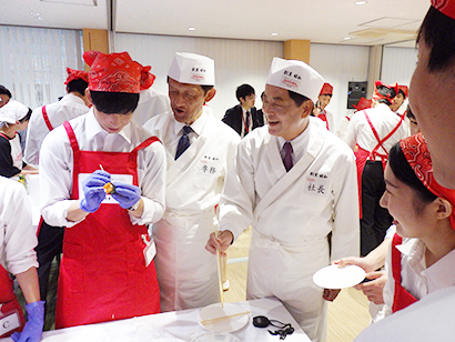 天ぷら職人の装いで天ぷら調理を教える新妻一彦社長(中央右)と中村圭介専務(同左)