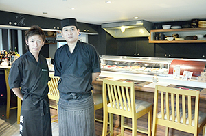 素材にこだわる「三陸寿司」。店長の泉さん(左)と板長のヌーさん=バンコク・スクンビット地区で小堀晋一が4月22日写す
