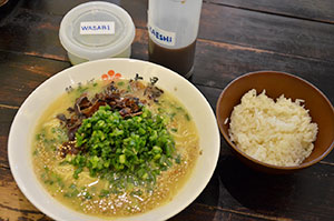 1杯80バーツの「ネギ鶏そば」 とタイ米を鶏スープで炊 き上げた「鶏白湯ごはん」 =バンコク・トンロー地区 で小堀晋一が 15 年 12 月 14 日写す
