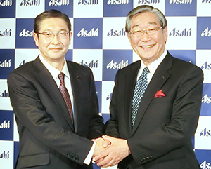 アサヒグループホールディングスは9日、トップ人事を内定するとともに、泉谷直木社長(写真(右))と小路明善次期社長(同(左)、アサヒビール社長)が東京都内で会見した。3月24日以降、代表取締役会長兼CEOとなる泉谷氏は「初代アサヒGHD社長として第4次、5次の中期経営計画を実行してきた。注力してきた人材育成も進み、6次中計は新たな体制がふさわしいと判断した」と社長交代の理由を語った。同じく代表取締役社長兼COOに就任する小路氏は「日本発の強みを生かした高付加価値型のグローバル