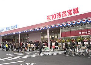【東北】東北の有力食品スーパー(SM)ヤマザワ(山形市)は10日、寒河江プラザ店(写真、山形県寒河江市横道65-1)をオープンした。 商品の搬入がしづらかったり、衣料売場が広いなどの問題で、隣接地へスクラップ・アンド・ビルドした店舗。2ヵ月間休業していた。 SM売場の面積は約1940平方m、ヤマザワ薬品約800平方m、別棟アベイル約1160平方m。駐車台数は388台、年商18億円を見込む。これによって、同社店舗数は山形県4