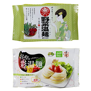 【東北】麺どころ宮城県白石市のメーカー2社は麺、パッケージをこれまでの商品とがらりと変え新製品を発売した。ひやむぎ、そうめん、うどんの白物が低迷する中で卸、小売ともに期待している。 白石興産が3月1日発売したものは「野菜温麺」(写真(上))。白石名産30mmの短い麺の原料小麦粉は県産あおばの恋で、これに有機野菜の赤ピーマン、ホウレン草を練り込み、自然な色の麺に仕上げた。野菜は県北登米市の「おっとちグリーンステーション」で生産されたものを使用、同市の
