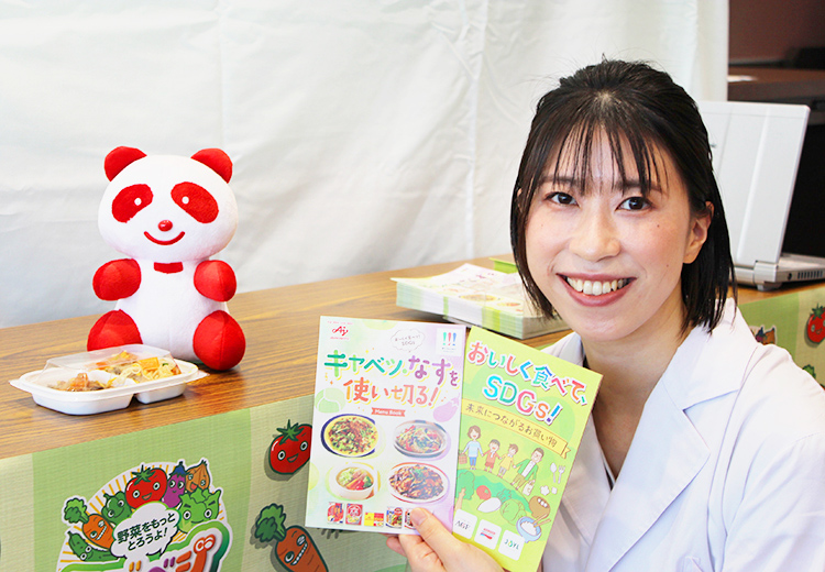 【東北】味の素東北支社は5日、ウジエスーパー利府店(宮城県利府町)でベジプラスコラボ「野菜でSDGs!」勉強会を開催した。野菜摂取量が全国平均以下の宮城県はベジプラスプロジェクトを推進していて、今回3者連携し、野菜摂取のアップとフードロス削減を図ろうと取り組んだ。県の年代別平均野菜摂取量を見るとすべての年代で不足しており、特に20歳代、40歳代の不足が顕著。 勉強会では同社の管理栄養士中村理乃さんがフードロスの現状、日本人の野菜不足、フードロス削減
