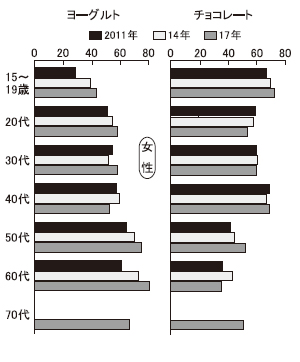 日本能率協会総合研究所は今年6月、首都圏在住の15~79歳の男女を対象に「おやつ・間食に関する実態調査」を実施し、菓子・デザート・軽食などの“おやつマーケット”を探った。菓子・デザート・軽食19ジャンル中、よく食べるジャンルは「パン類」57%、「ヨーグルト」「チョコレート」が50%台で続いた。このうち、近年健康に良いと評判の「ヨーグルト」「チョコレート」について、性・年代別に分析した調査を紹介する。 「ヨーグルト」をよく食べる層は、女性60代が80