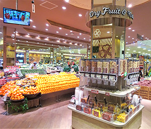 ライフコーポレーションが6日に開設した桜新町店(東京都世田谷区)は、旗艦店として新商品・カテゴリーを複数導入している。農産ではドライフルーツとナッツをバルク什器で販売する。利用者は容量別のカップに好みの商品を選んで詰める。水産は冷食のミールキット商材をコーナー化した。メニュー別にカット済みの素材がパックになっている。ベーカリーは生食用に滑らかな食感に仕上げた「煌(きらめき)」を商品化したほか、専用カウンターで提供するオーダー商品の新メニューとしてPB(自主企画品)牛乳が原料