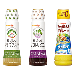 日清オイリオグループは今秋、ドレッシングの展開ラインアップを拡充する。9月2日からローオイルタイプの「日清ドレッシングダイエット」に「色々使えるカレー味」を、オイルの特性で味覚を高めた「日清サラドレ」に「あじわいオリーブフレンチ」と「あじわいバルサミコ」をそれぞれ追加する。 「色々使えるカレー味」は、人気料理の代表であるカレー味をドレッシングで商品化、サラダをはじめ、野菜料理や肉料理などにかけるだけで、気軽にカレー味を楽しむことができる。多彩なメニ