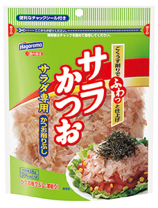 ●「サラかつお」メニュー提案積極化 消費シーン充実目指す はごろもフーズの削り節関連事業は、「つゆ」などの和風調味料や顆粒だしへ需要がシフトし、だしをとる契機そのものが減少しているなか、カツオの魚価高騰など収益圧迫要因も増え、全般的に厳しい状況が続いている。一方で近年では、注力商品「サラかつお」を使ったレシピ提案を推進、需要拡大を視野に入れた付加価値戦略を強化。原料事情・消費環境が悪化する中で、今秋も消費シーンの充実を目指す。