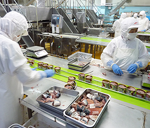 マルハニチロ北日本青森工場(山崎智教工場長)は、本州最北端の地の利を生かした原料調達力、国内でもトップクラスとなる規模と設備、管理システムを保有、同社グループの缶詰製品を多数製造している。中でも「さば缶」は優れた原料調達力を生かし、日本一の製造数量を堅持。優良漁獲地に隣することから、ホタテ、イカなどの水産缶詰も多数商品化している。缶詰記者会はこのほど、同工場見学会を開催、旬を迎えている「さば缶」製造工程など、同工場の体制と製造活動を視察した。 同工
