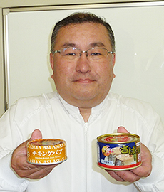 「さば缶」「アジアン味」を手にする山崎智教工場長