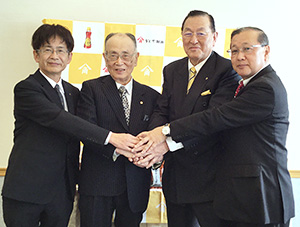強力タッグで活性化へ意欲を示す写真左から高田直幸カタギ食品社長、片木精治同相談役、小澤二郎かどや製油社長、馬場宗夫同取締役(カタギ食品副社長を兼任)