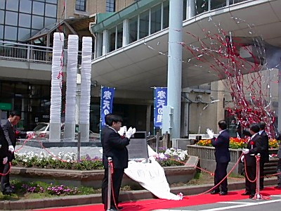 【長野】長野県寒天水産加工業協同組合(五味徳雄組合長)は5日、JR茅野駅前広場に角寒天を模したガラス製モニュメントを竣工させ、市政50年を迎えた茅野市に寄贈した。モニュメントは05年の寒天ブームと寒天の日(2月16日)制定を機に、「寒天の里」で地域振興を進めている市や商工会議所と協力しイメージ高揚を進め、後生に伝統的な寒天を伝承しようと約1200万円をかけ完成させた。 モニュメントは、高さ250cm、30cm角のガラス柱3本を並べ、ガラス製では国内