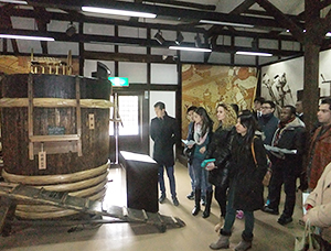 官民連携による日本酒セミナー。清酒メーカーの酒蔵を見学する海外外交官ら(この日は34ヵ国から参加、月桂冠大倉記念館にて。15年2月)