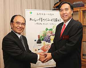 「信州の食を世界に」と力を合わせる長野県知事・阿部守一氏(右)と伊那食品工業会長・塚越寛氏