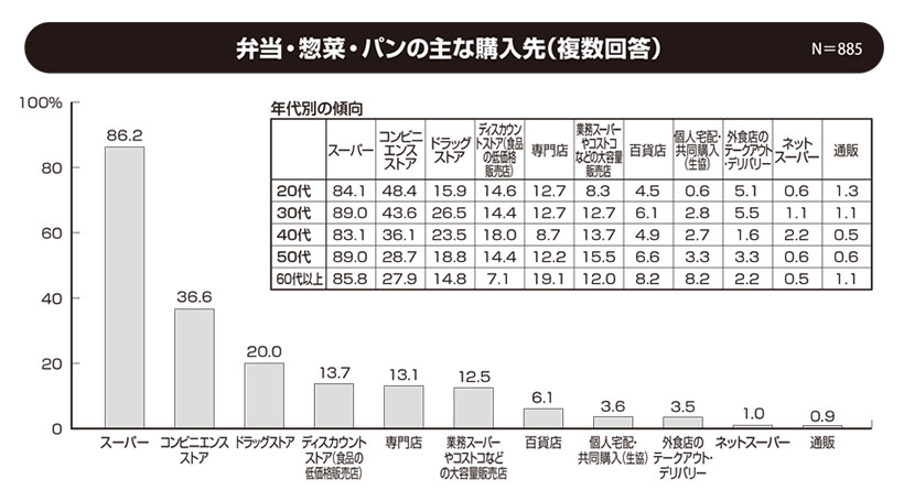 特集 総合 2026.01.29●利用している食品の購入先(購入店舗)について N=1000 ◇スーパー一極集中は今年も変わらず 利用している食品の購入先(購入店舗)は、全体では「スーパー(総合スーパー、食品スーパー)」(93.8%)が例年と変わらず突出して高く、「ドラッグスト…続きを読む