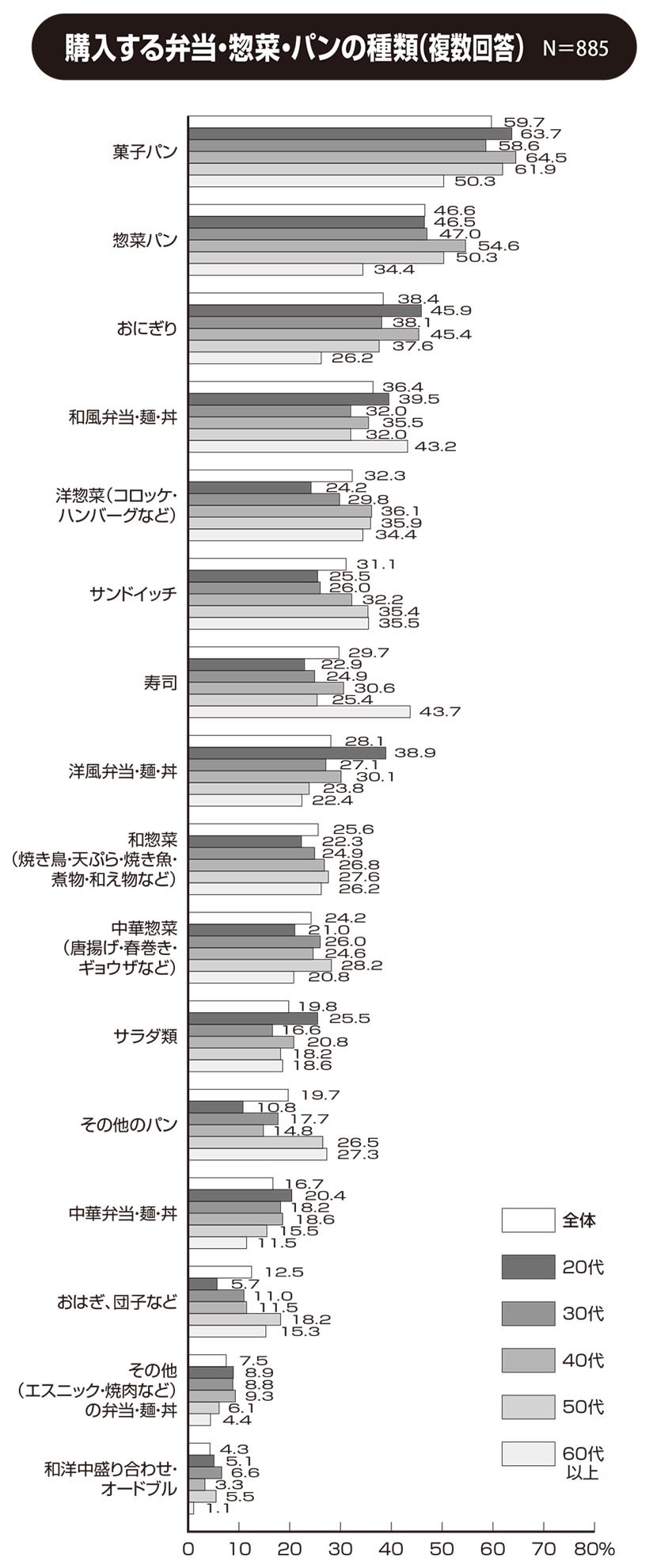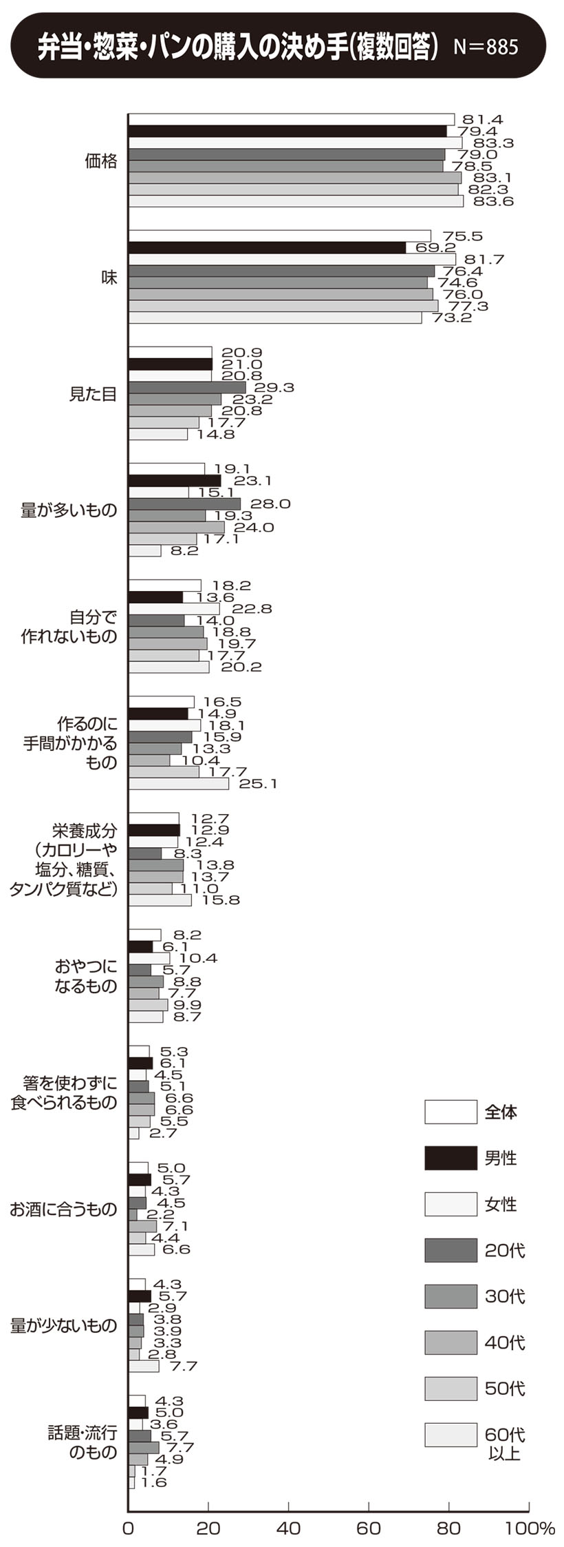 惣菜 特集 総合 2026.01.29●弁当・惣菜・パンの購入頻度(週) N=997 ◇8割以上が週1回以上購入 市販の弁当・惣菜・パンを購入する頻度は週に「1回」が25.0%と最も多く、次いで「2回」、「0回」の順に高かった。性年代別の傾向を見ると、「1回」と答える割合は女性20代…続きを読む