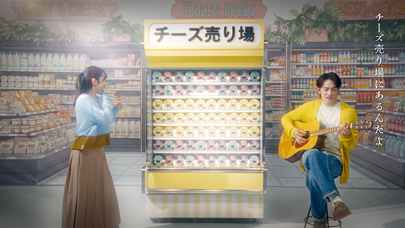 同CMは、スーパーマーケットを舞台にストーリーを展開。「Q・B・Bチーズデザート6P」の売場を探し回る女性を見つけた町田が、無言の商品に代わり「ここにいるよ」と自身の歌で呼び掛ける。チーズ売場に並ぶ同品を