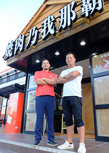 一昨年に開業した「焼肉乃我那覇新館」は150席(週休1日)で月間1万人強を集客。うち外国人客が半数を占める。我那覇宏生専務(右)と加工場を仕切る実弟・俊佑氏