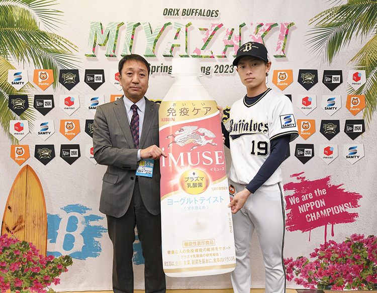 ●オリックス・バファローズ春季キャンプ地に 【関西】キリンビバレッジ近畿圏統括本部は3日、オリックス・バファローズの今シーズンの活躍を祈念し、選手の体調管理を支援するため、同社の免疫ケアブランド「iMUSE(イミューズ)」商品計1440本を宮崎市の春季キャンプ地に贈呈した。 球団へ贈呈した商品は「キリン iMUSE レモン」480本、「キリン iMUSE 水」480本、「キリン iMUSE ヨーグルト」240本、「キリン